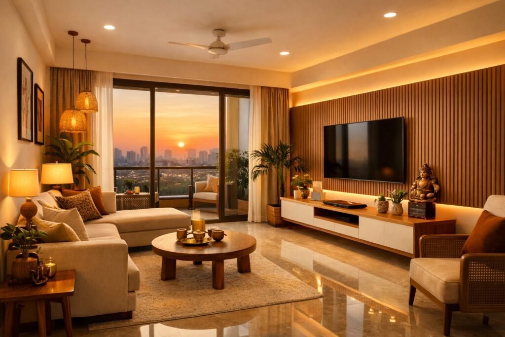 In a 2BHK, the living room is the multi-tasker. It’s your cinema, your office, and your guest lounge. We focus on: